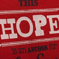 This tote bag is red and white in color and reads "This hope is an anchor for the soul, firm and secure" on the front and the back. It is inspired by Hebrews 6:19 which reads, "We have this hope as an anchor for the soul, firm and secure. It enters the inner sanctuary behind the curtain."