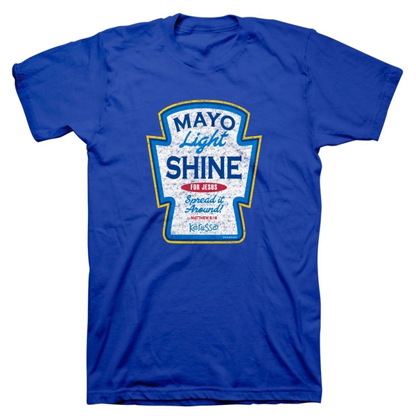 This t shirt reads "Mayo light shine for Jesus, spread it around" on the front and is inspired by Matthew 5:16 which reads, "Let your light shine before others, that they may see your good deeds and glorify your Father in heaven."