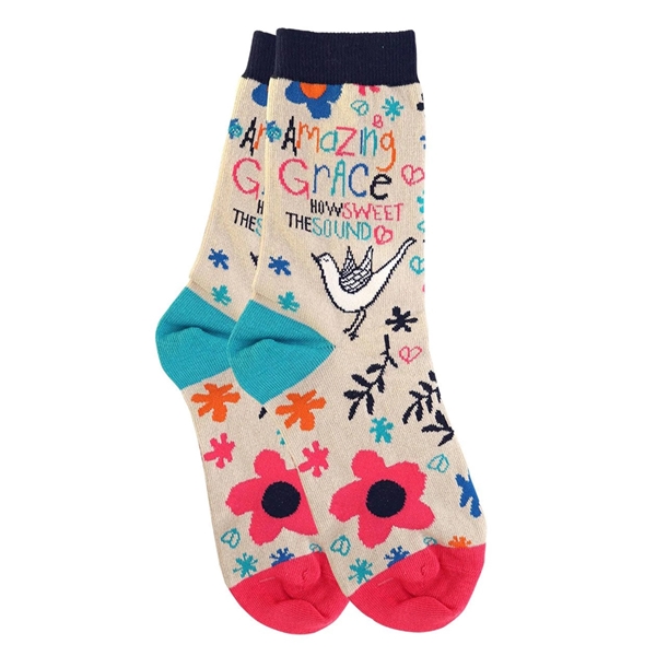 Share God's amazing grace with everyone! These socks feature the phrase "Amazing Grace, how sweet the sound" with flowers and a dove on the sides.