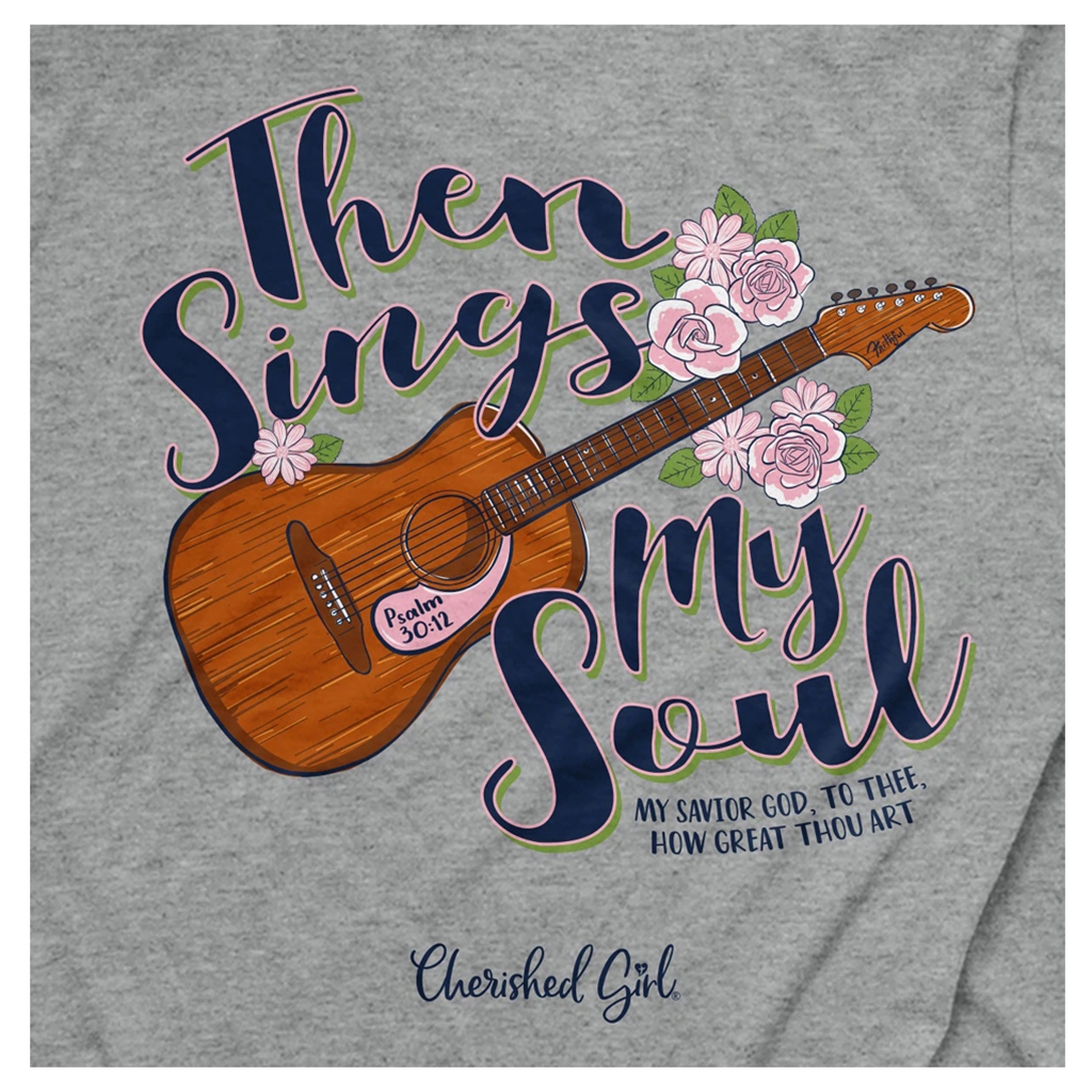 Sing the praises or our savior to everyone you meet and share your faith in the Lord. This t-shirt features the phrase "Then sings my soul, my savior God, to thee how great thou art" with a guitar and flowers in the design.